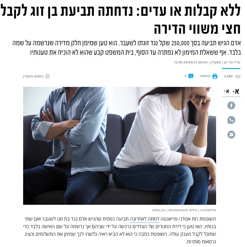 ללא קבלות או עדים: נדחתה תביעת בן זוג לקבל חצי משווי הדירה