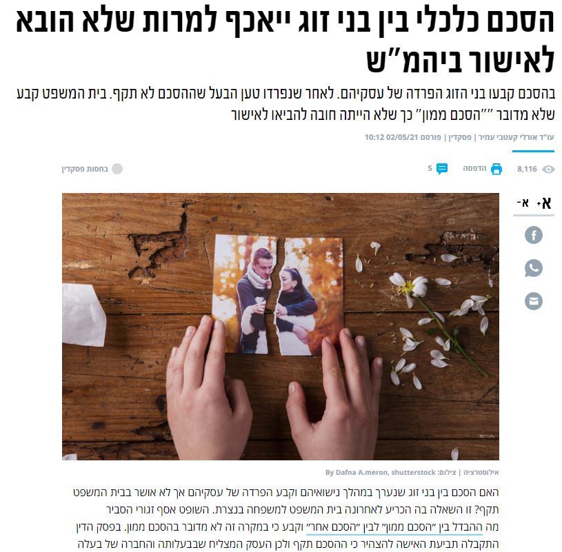 הסכם כלכלי בין בני זוג ייאכף למרות שלא הובא לאישור ביהמ"ש